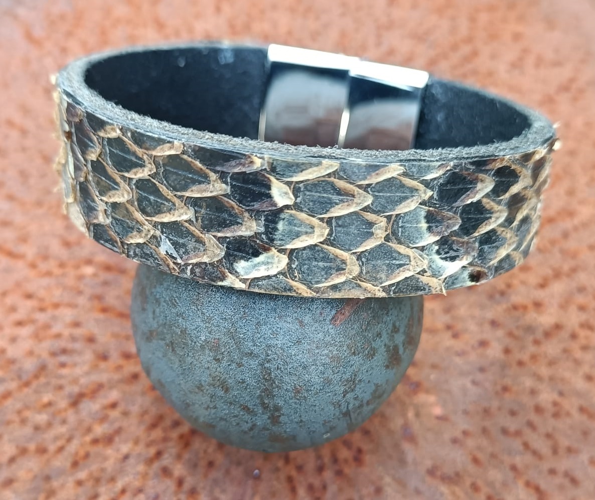 Deze slangenleren armband is met de hand gemaakt wat ook elke armband uniek maakt door zijn patroon. Niet elke armband heeft het zelfde patroon en is daarom een uniek sieraad voor om je pols. De armband heet een RVS sluiting van 3 cm.