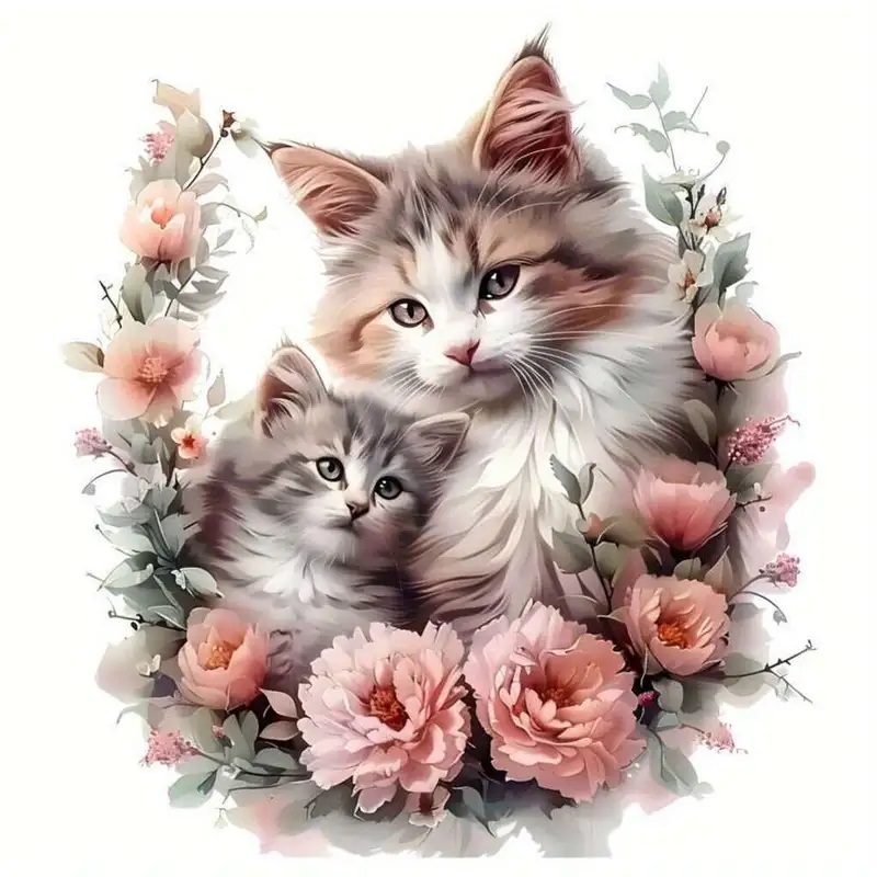 ** Heat-Transfer van Mama en dochter kat tussen bloemen