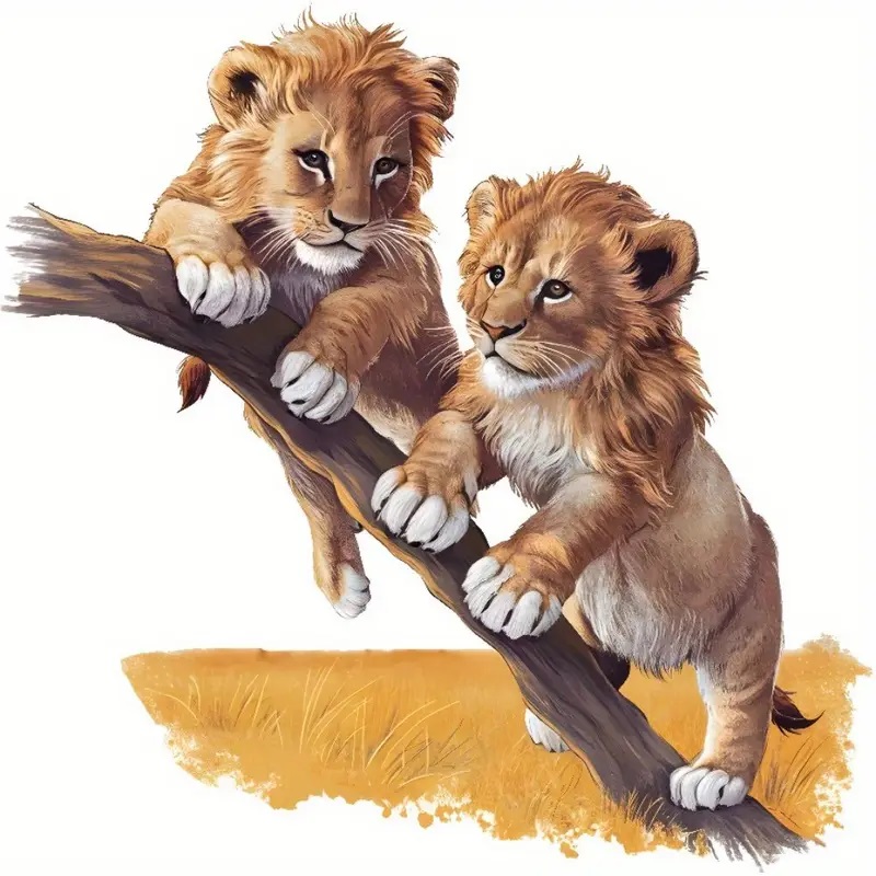 ** Heat-Transfer van Twee jonge leeuwen op een boom ( cartoon ). Afmeting 21.8.2×22 cm. Snel, eenvoudig en makkelijk te gebruiken. Kan op allerlei stoffen producten gebruikt worden. Dit artikel nemen wij na bestelling niet retour.