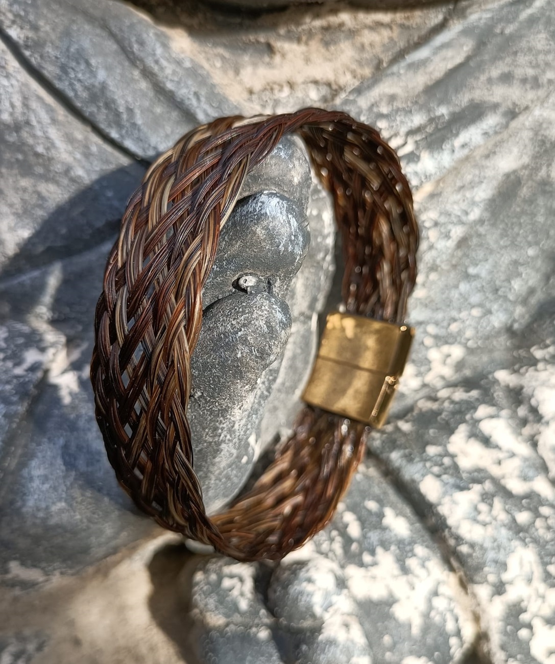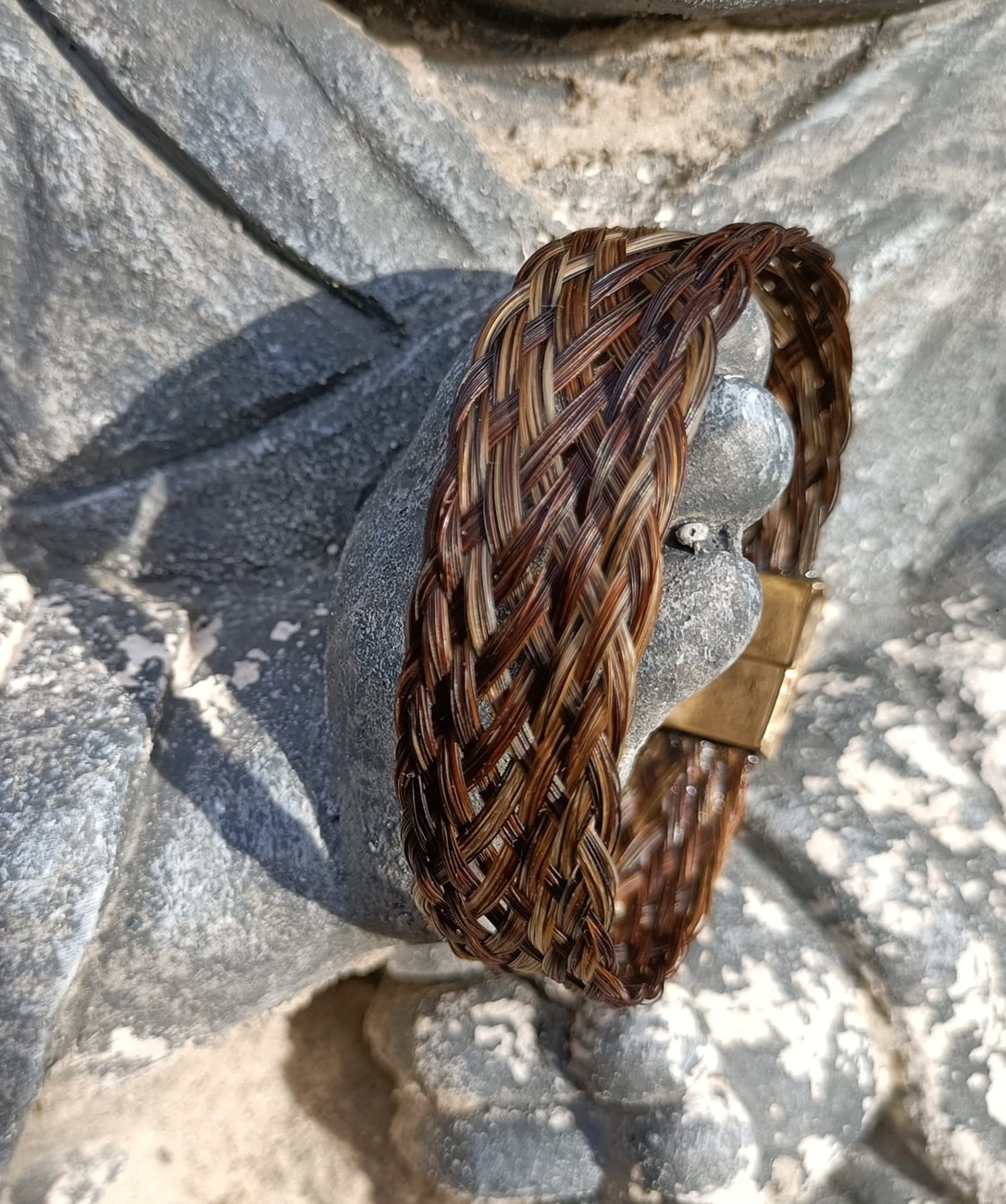 ** Gevlochten armband gemaakt van echt paardenhaar. Deze armband is gemaakt van bruin paardenhaar. Goud kleurige RVS sluiting van 2cm lang en 1,7breed. Geschikt voor een pols van 18cm a 18,5cm